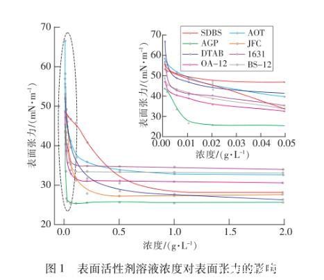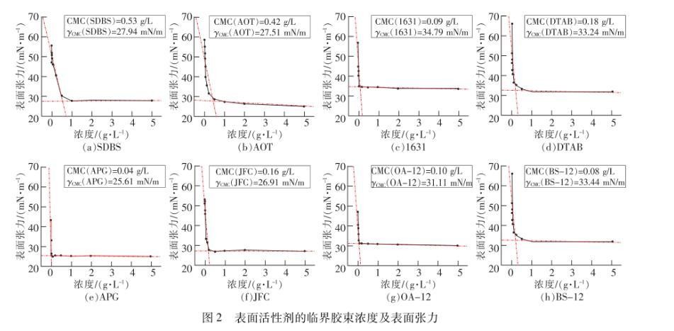 表面活性剂溶液的表面张力与浓度及自身性质密切相关。在达到临界胶束浓度之前,溶液浓度越大,表面张力越小。在8种表面活性剂中,阳离子及两性型表面活性剂虽然具有较低的临界胶束浓度,但是降低表面张力的能力较差;阴离子表面活性剂的临界胶束浓度值最高,但在降低溶液表面张力方面性能优越;非离子表面活性剂APG形成胶束能力、降低表面张力能力均为最强。
