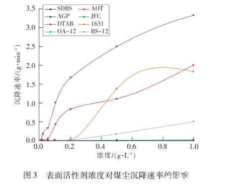 通过煤尘在表面活性剂溶液中静态沉降实验可以直观反应表面活性剂对煤尘的润湿效果。01 g煤尘在50 mL表面活性剂溶液样品中的沉降时间见表3,将沉降时间换算成沉降速率的结果如图3所示。煤尘在自来水中的沉降实验时间超过1 h。