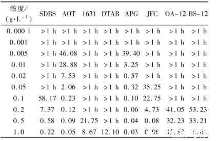 2)表面活性剂溶液的表面张力与其自身性质及浓度密切相关。8种表面活性剂溶液表面张力随浓度的增大先减小后在临界胶束浓度附近稳定,其表面张力均远小于水的表面张力。因8种表面活性剂的性质不同,临界胶束浓度值和表面张力值分别在0.04~053 g/L和25.61~34.79 mN/m之间差异较大。8种表面活性剂按降低溶液表面张力的能力由强到弱排序为:APG>AOT>JFC>SDBS>OA-12>BS-12>1631>CTAB,非离子>阴离子>两性型>阳离子。非离子表面活性剂APG形成胶束和降低表面张力能力均为最佳,其临界胶束浓度为0.04 g/L,表面张力为25.61 mN/m。