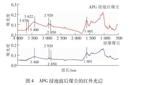 由上述实验结果可以看到,在8种表面活性剂中,非离子表面活性剂APG形成胶束和降低表面张力的能力最强,润湿煤尘效果最好。通过测定APG浸泡前后煤尘表面官能团及粒径分布特征的变化,分析其润湿煤尘的作用机理。