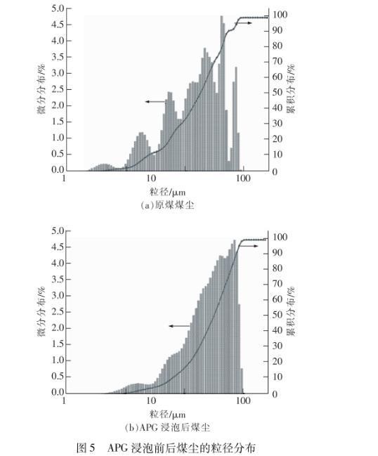 由图5可见,经APG浸泡后煤尘粒径增大。原煤煤尘的平均粒径为22.62μm,经APG浸泡后增大到3518μm。浸泡前煤尘的粒径分布不均匀,粒径众数为48.41μm,浸泡后煤尘粒径的均一性增强,呈较典型的正态分布,粒径众数也增大至76.51μm。这说明煤尘表面亲水官能团的增加和分子间缔合氢键的形成,促使煤尘之间发生了团聚作用,使原本无法发生重力沉降的“小粒径”煤尘变成了能够发生重力沉降的“大粒径”颗粒,加快了沉降速率,缩短了沉降时间,与煤尘沉降实验结果一致。