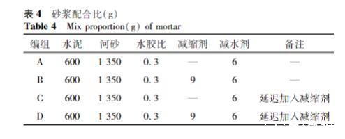 制备四组砂浆,B、D组中的水用SRA按照5%(质量分数)进行替换。B组中的SRA与水混合后直接加入水泥中搅拌,A组除不含SRA外与B组一致。而C、D组分两步混合,C组先只加入95%的水进行搅拌,完成后用塑料薄膜覆盖搅拌锅静置15min,然后加入余下的水以中速搅拌3min,D组与C组唯一不同的地方在于先加入95%的水,最后加入的是余下5%的SRA,具体如表4所示。