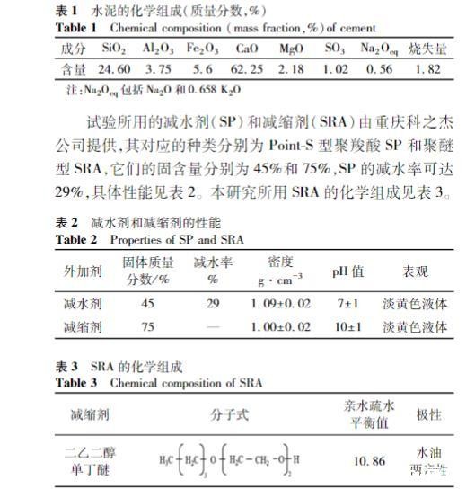 试验所用的减水剂(SP)和减缩剂(SRA)由重庆科之杰公司提供,其对应的种类分别为PointS型聚羧酸SP和聚醚型SRA,它们的固含量分别为45%和75%,SP的减水率可达29%,具体性能见表2.本研究所用SRA的化学组成见表3.