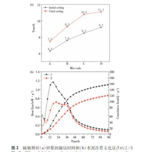 图2减缩剂对(a)砂浆的凝结时间和(b)水泥净浆水化放热的影响