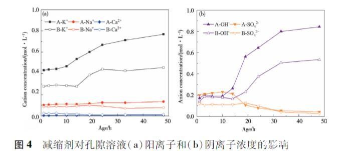 图4减缩剂对孔隙溶液(a)阳离子和(b)阴离子浓度的影响