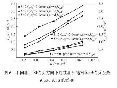 图6不同相比和传质方向下连续相流速对体积传质系数Koda、Koca的影响