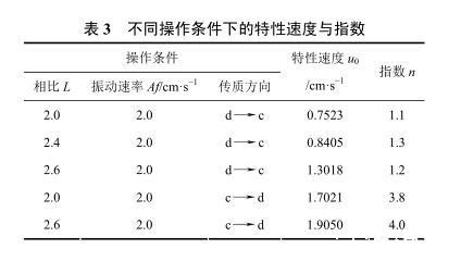 由表3中数据可以看出d→c的指数n在1.2左右,c→d的n在3.9左右,说明指数只与体系的物性有关,与操作条件无关,传质方向不同导致指数n不同主要是有机相和水相分别作分散相的缘故。而特性速度与相比有关。由表3实验结果可以看出,正丁醇-丁二酸-水体系的特性速度同时受两相流速、相比和传质方向的影响,它们都对液滴大小有影响。