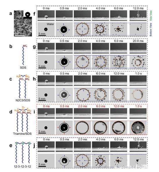 图1.高速液滴撞击超疏水表面的动态行为。a)扫描电子显微镜(SEM)揭示了表面的微观结构。插图:水接触角为161.3±1.1°,确保超疏水性。b–e)表面活性剂的分子结构。f)撞击超疏水表面的水滴出现飞溅和反弹。g–j)分别含有SDS、N2C3/SDS、三胺/SDS和12-3-12-3-12添加剂的水滴在超疏水表面上的撞击动力学的侧面和仰视图。g,h)含有SDS或N2C3/SDS添加剂的液滴抑制了反弹,但仍会产生飞溅或后退破碎。i)含有三胺/SDS的液滴一旦与基材接触就会形成稳定的周边边缘,随后完全沉积在超疏水表面上而不会发生任何飞溅或碎裂。完全均匀的润湿膜在达到最大扩散面积后保持不变。j)合成低聚表面活性剂12-3-12-3-12添加剂对水滴的影响影响不大。溅射和反弹仍然会发生。箭头的长度表示扩散或反弹速度的变化。