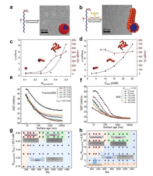 图2.撞击结果的物理化学性质和相图。a,b)SDS和三胺/SDS聚集状态的示意图和低温透射电镜图像。a)单独的SDS形成小的球形胶束,用虚线矩形突出显示。b)加入三胺后,三胺/SDS形成长而密集的缠结线性胶束。c,d)在不同摩尔比R和摩尔浓度CSDS下三胺/SDS的粘度和聚集长度。在临界摩尔比或摩尔浓度之后,胶束伸长并缠结成网络结构,导致粘度急剧增加。e,f)不同R和CSDS下三胺/SDS的动态表面张力(DST)曲线。随着R和CSDS的增加,初始和平衡表面张力均显着降低。g,h)不同We数下三胺/SDS液滴撞击超疏水表面的动态行为相图。在高We下,含有三胺/SDS添加剂的液滴只有在特定的摩尔比(0.45–0.50)和特定的摩尔浓度(>20.0×10−3 m)下才能完全沉积在超疏水表面上。