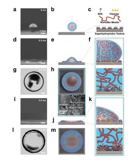 图3.活性低聚表面活性剂高速撞击超疏水表面后均匀铺展的示意图。a、b)液滴包含三维缠结的蠕虫状胶束网络。c)SDS、三胺、蠕虫状胶束和具有微/纳米结构的超疏水表面的示意图。d–h)表面活性剂分子快速扩散到新形成的界面,并紧密堆积在水-空气界面。蠕虫状胶束被迫伸展以固定水。在快速扩散过程中,扩散边缘稳定且均匀。h)蠕虫状胶束的密集网络缠绕着基底的微纳米结构,三胺/SDS液滴撞击后的低温扫描电镜图像支持了这一观点,其中较大的图像显示了较小图像底部的网络。f)表面活性剂分子与基质具有很强的相互作用,蠕虫状胶束网络与基质的微/纳米结构缠绕在一起。i–m)在最终平衡状态下,致密的蠕虫状胶束存在于扩散外围并与微/纳米结构缠绕在一起。左栏中所有液滴的比例尺均为1毫米。