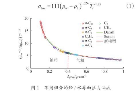 式中,Δρwh为烃水密度差,g/cm3;σhw为烃水、气水或者油水界面张力,mN/m;ρw为水的密度,g/cm3;ρh为烃的密度或者气和油的密度,g/cm3;Tr为拟对比温度。