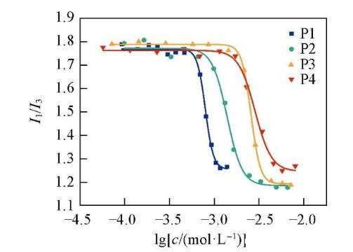 由图3可见,当表面活性剂的浓度较低时,I1/I3在1.70——1.80之间波动;当表面活性剂浓度逐渐增加至cmc时,I1/I3值急剧下降,说明表面活性剂分子开始形成胶束,使得芘分子转移至疏水胶束内,芘分子所处的环境极性发生突变;在较高表面活性剂浓度下,I1/I3值趋于稳定,这是由于芘分子已经完全处于胶束中,所处的环境极性不再发生变化。通过Boltzmann方程拟合得到表面活性剂P1,P2,P3和P4的cmc值分别为7.96×10-4,1.39×10-3,2.57×10-3和2.85×10-3 mol/L。结果表明,随着聚氧乙烯链长度的增加,cmc逐渐增大。采用荧光法测得的cmc与采用表面张力法测得的cmc数值接近且变化趋势一致。