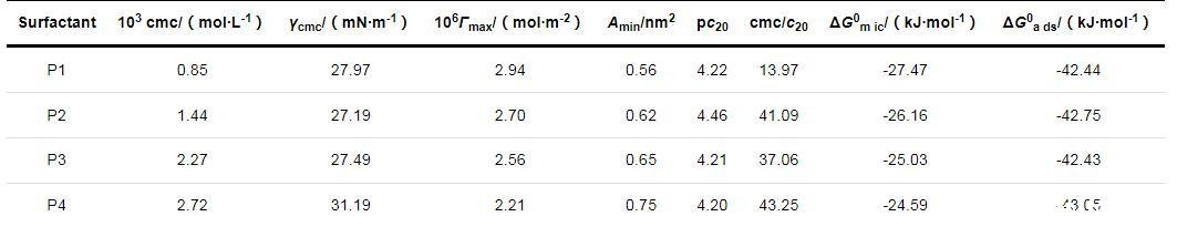 利用ΔG0a ds和ΔG0m ic表征表面活性剂的热力学性质。P1,P2,P3和P4的ΔG0a ds和ΔG0m ic均小于0,说明表面活性剂在气/液界面层上的吸附行为以及在水溶液中形成胶束的行为是自发进行的。4种表面活性剂的ΔG0a ds均小于ΔG0m ic,表明表面活性剂分子在溶液中会先形成吸附层,当气/液界面吸附达到饱和状态后才开始在溶液内部形成胶束聚集体。