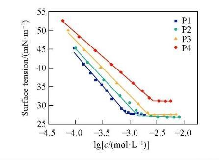 为研究4种非离子Gemini表面活性剂的表面活性,采用液滴体积法测定了不同浓度下的表面张力。图2示出P1,P2,P3和P4的溶液表面张力与浓度对数的关系。溶液的表面张力随浓度的增加而降低,当溶液的浓度高于cmc后,表面张力达到最低值并基本趋于稳定。这是由于随着表面活性剂浓度的升高,在气/液界面上吸附的表面活性剂分子数量增多,界面上的分子排列越来越紧密,表面张力持续下降;当表面活性剂浓度达到cmc后,溶液内部的分子开始聚集形成胶束聚集体,表面活性剂分子在界面上达到饱和吸附,因此cmc之后表面张力趋于稳定。