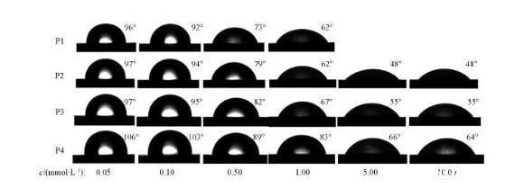 由图2可知,P1,P2,P3和P4的cmc分别为8.51×10-4,1.44×10-3,2.27×10-3和2.72×10-3 mol/L;γcmc分别为27.97,27.19,27.49和31.19 mN/m.可见,随着聚氧乙烯链长度的增加,4种非离子Gemini表面活性剂的cmc逐渐增加,这是由于随着聚氧乙烯链长度的增加,表面活性剂的疏水作用减弱,不利于胶束的形成。γcmc随着聚氧乙烯链长度的增加先减小后增加,其中P2的γcmc最低,为27.19 mN/m,这可能是由于P2分子内部的亲水性和疏水性达到了平衡,能稳定排列在气/液界面上,降低表面张力的能力最强。P2,P3和P4的γcmc随着聚氧乙烯链长度的增加逐渐升高,这是由于亲水性聚氧乙烯链长度的增加使得表面活性剂分子在水溶液中卷曲程度增大,在界面处占据的空间增大,降低了分子在界面上的铺展紧密度,从而导致γcmc升高。