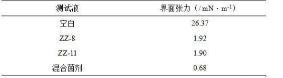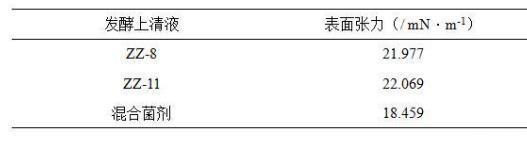 表面张力是洗油剂对原油洗脱能力的重要指标,数值越低、洗脱能力越强。测试结果显示解淀粉芽孢杆菌(Bacillus amyloliquefaciens)ZZ-11和胶冻样芽孢杆菌(Bacillus mucilaginosus)ZZ-8发酵上清液均能降低表面张力,混合菌剂发酵上清液的表面张力值更低。