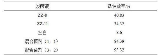 各组洗油效率测试结果如表3所示,解淀粉芽孢杆菌(Bacillusamyloliquefaciens)ZZ-11和胶冻样芽孢杆菌(Bacillus mucilaginosus)ZZ-8发酵液均具有优秀的洗油效率,本发明混合菌剂的洗油效率更为优异,分别达到84.39%和93.32。
