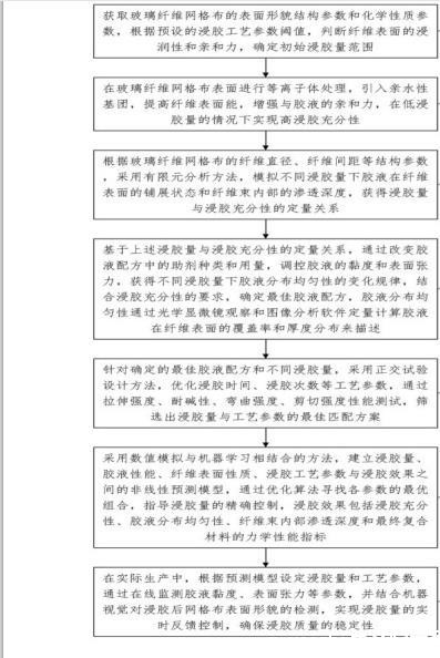 获取玻璃纤维网格布的表面形貌结构参数和化学性质参数,根据预设的浸胶工艺参数阈值,判断纤维表面的浸润性和亲和力,确定初始浸胶量范围;在玻璃纤维网格布表面进行等离子体处理,引入亲水性基团,提高纤维表面能,增强与胶液的亲和力,在低浸胶量的情况下实现高浸胶充分性;根据玻璃纤维网格布的纤维直径、纤维间距等结构参数,采用有限元分析方法,模拟不同浸胶量下胶液在纤维表面的铺展状态和纤维束内部的渗透深度,获得浸胶量与浸胶充分性的定量关系;基于上述浸胶量与浸胶充分性的定量关系,通过改变胶液配方中的助剂种类和用量,调控胶液的黏度和表面张力,获得不同浸胶量下胶液分布均匀性的变化规律,结合浸胶充分性的要求,确定最佳胶液配方,胶液分布均匀性通过光学显微镜观察和图像分析软件定量计算胶液在纤维表面的覆盖率和厚度分布来描述;针对确定的最佳胶液配方和不同浸胶量,采用正交试验设计方法,优化浸胶时间、浸胶次数等工艺参数,通过拉伸强度、耐碱性、弯曲强度、剪切强度性能测试,筛选出浸胶量与工艺参数的最佳匹配方案;采用数值模拟与机器学习相结合的方法,建立浸胶量、胶液性能、纤维表面性质、浸胶工艺参数与浸胶效果之间的非线性预测模型,通过优化算法寻找各参数的最优组合,指导浸胶量的精确控制,浸胶效果包括浸胶充分性、胶液分布均匀性、纤维束内部渗透深度和最终复合材料的力学性能指标;在实际生产中,根据预测模型设定浸胶量和工艺参数,通过在线监测胶液黏度、表面张力等参数,并结合机器视觉对浸胶后网格布表面形貌的检测,实现浸胶量的实时反馈控制,确保浸胶质量的稳定性。