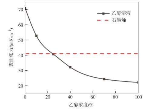 但是NMP存在价格昂贵、环境污染大的缺点,因此寻求一种环境友好、成本低的球磨溶剂对微晶石墨细化产业化具有重要的意义。水和乙醇的表面张力分别为70.95 mN·m-1和22.17 mN·m-1,我们采用一定体积比的乙醇和水调配出与微晶石墨表面能接近的乙醇水溶液,并以此为溶剂球磨微晶石墨,研究溶剂的表面张力对球磨后微晶石墨粒径的影响。从图1可知,25%乙醇溶液的表面能为40.69 mN·m-1,与石墨烯的表面能(40.80 mN·m-1)相近,从图2可知,其对应的微晶石墨中位粒径最小。当溶剂的表面能与微晶石墨表面能相近时,微晶石墨能更好地分散在溶剂中,从而提高球磨效率。所以在本工作中,选择25%的乙醇水溶液作为球磨溶剂。