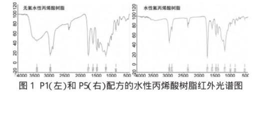 为了表征含氟丙烯酸酯单体是否已经有效成为合成树脂的一份子,我们对P1(不含氟的水性丙烯酸树脂)和P5(水性氟丙烯酸树脂)进行了红外光谱分析(图1)。