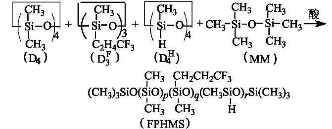 在装有搅拌器、温度计、回流冷凝管的四口烧瓶中,按n(D4)∶n(D3F)∶n(D4H)∶n(MM)=1∶1∶1∶1比例依次加入D4、D3F、D4H、MM,搅拌下加热升温至50——60℃,缓慢加入浓H2SO4(占单体总的质量分数3%),控温在50——60℃反应4 h.后升温至80——90℃,加适量Na2CO3,反应数小时,使体系pH近5——6,冷却,静置,抽滤,得无色透明液体,即中间体含氟含氢聚硅氧烷(FPHMS),其含Si-H基的氢质量分数为0.343%.反应式为: