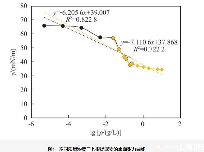 2.1.2三七根提取物的表面张力、临界胶束浓度、pc20及HLB值
