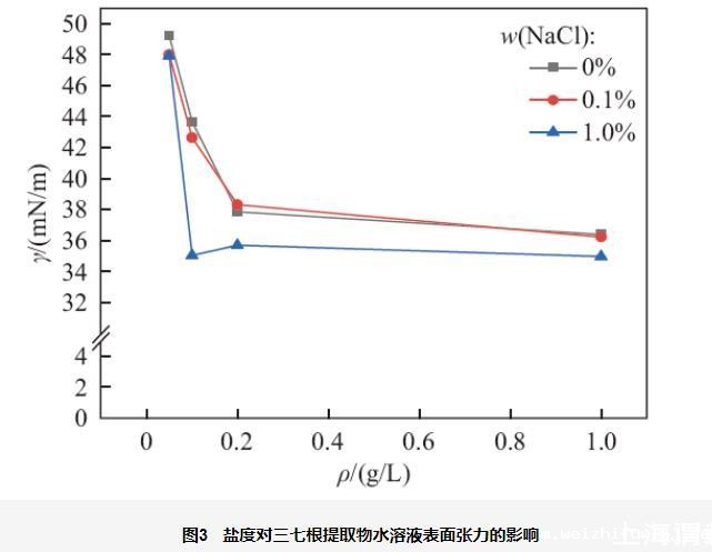 不同质量浓度、pH、盐度对三七根提取物水溶液表面张力的影响(二)