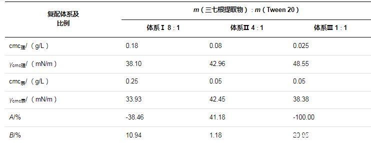 由表2可知,三七根提取物与Tween 20按不同质量比复配后,均表现出一定程度的降低溶液表面张力能力增效。复配体系降低溶液表面张力的能力增效比较:体系Ⅲ>体系Ⅰ>体系Ⅱ;复配体系形成胶束的能力增效比较:体系Ⅱ>体系Ⅰ>体系Ⅲ。其中,体系Ⅱ形成胶束的能力增效41.18%,表明其形成胶束的能力较强。体系Ⅱ降低溶液表面张力的能力可以增效1.18%。在理论最佳复配质量比下,复配体系cmc为0.05 g/L,γcmc为42.45 mN/m,复配增效作用比较明显,因此选择m(三七根提取物)∶m(Tween 20)=4∶1进行复配。