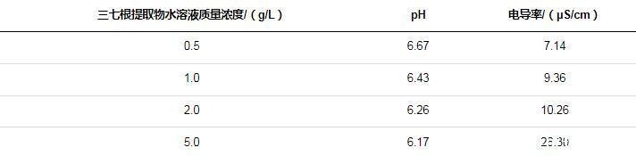 将三七根提取物配制为5 g/L的水溶液并稀释至各待测浓度,测定其pH值和电导率,结果如表1所示。由表1可知,三七根提取物水溶液呈弱酸性,电导率较低。Russell提出可以使用电导率仪来计算溶液的离子浓度,以此来量化物质的离子性强弱。因此,三七根提取物在水溶液中的离子性较弱,属于一种非离子表面活性剂。