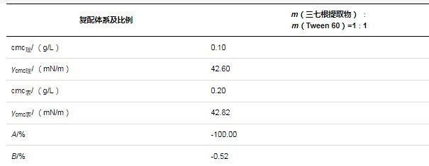 由前文实验结果可知,三七根提取物与Tween 60的cmc均为0.1 g/L。根据2.3.2中方法,确定了三七根提取物与Tween 60复配质量比为1∶1。在25℃下,复配体系理论值和表观值如表3所示。三七根提取物与Tween 60的复配体系形成胶束的能力减效100%,降低溶液表面张力的能力减效0.51%。结果表明,三七根提取物与Tween 60按1∶1质量比复配后,并不能对体系产生明显的协同增效作用,这可能与三七根提取物和Tween 60的含量、结构有关。