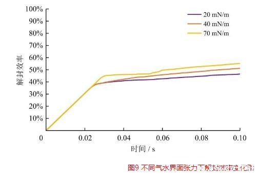 气水界面张力对注气解封过程及流体微观分布具有较大影响。建立70 mN/m、40 mN/m和20 mN/m等3种不同的气水界面张力的模型,分别代表润湿反转剂作用后的气水界面张力变化情况,研究不同气水界面张力条件下流体微观分布演化特征和解封效率差异性(图9)。从图中可以看出,随着气水界面张力的降低,毛细管力减小,大幅降低注气解封过程流体流动阻力,促进了气相优势通道的快速形成,说明气水界面张力的降低有助于减小解封压力,实现水封气藏的快速解封;但同时气水界面张力的降低,会导致气体微观波及效率降低,部分区域仍具有较高的含水饱和度,解封效率略微降低。因此,随着润湿反转剂浓度的增加,润湿反转剂能够降低气水界面张力,对解封过程产生明显的促进作用,但解封效率会略微降低。