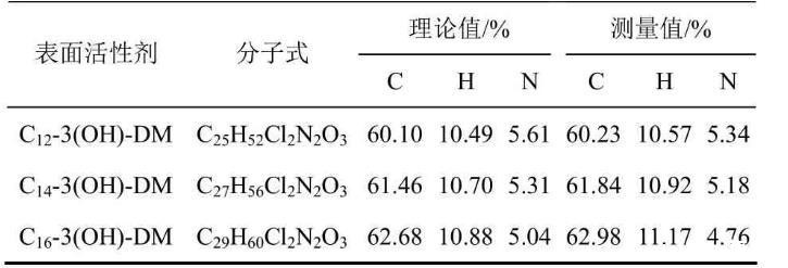 表1列出了元素分析得到的Cm-3(OH)-DM中C、H和N含量的测定值及其理论值。由表1可得,测定值与理论值非常接近。结合红外图谱、核磁共振氢谱及元素分析的数据可知,实验合成的化合物为目标产物反应型阳离子Gemini表面活性剂Cm-3(OH)-DM(m=12,14,16)。