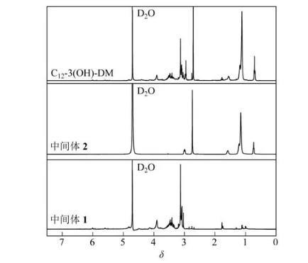 图3、图4是Gemini表面活性剂的核磁共振氢谱图。由图3、图4可知,目标产物通过与中间体1和中间体2的对比已反应合成,氢谱上的H峰位置和比例与Cm-3(OH)-DM的分子式一一对应,溶剂为D2O。目标产物C12-3(OH)-DM中δ=6.15、5.58为C=C—H的质子信号,δ=4.21为—COO—CH2的质子信号,δ=3.4~3.6为N—CH2—的质子信号,δ=3.12为N—CH3的质子信号,δ=1.77为C=C—CH3的质子信号,δ=1.12为—CH2—的质子信号,δ=0.76为—CH3的质子信号。图4显示,3种双子表面活性剂均已合成。