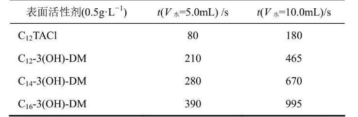采用量筒法进行表面活性剂乳化力的测定,结果见表4。双子表面活性剂比传统单子表面活性剂十二烷基三甲基氯化铵[1-2,22]分出相同体积水的时间长,且随着烷基碳链长度的增加,水相所分离出水量所用的时间也越长。这可能是因为在油/水界面上,吸附的表面活性剂分子之间排列越紧密,形成界面的膜强度越高。根据单分子吸附膜理论,界面张力减小,乳化性能越好,表现为从乳状液中分离出水所用的时间越长。随着烷基碳链长度的增加,碳氢链间的相互作用力更强,两个表面活性剂单体分子之间的连接更加紧密,形成的界面膜强度也越高,因此烷基碳链长度越长的双子表面活性剂的乳化效果越好。