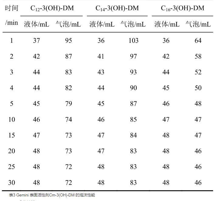 表3 Gemini表面活性剂Cm-3(OH)-DM的泡沫性能
