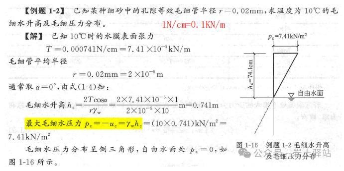 来自《土力学》式中,水膜张力T与温度有关,单位:N/cm或KN/m;10°时,T=7.41×10-4N/cm=7.41×10-5KN/m;方向与毛细管成夹角α,该角度的大小与土颗粒矿物成分和水性质有关;