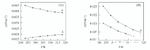 溶有萃取剂时,不同稀释剂体系中界面张力随温度升高的变化趋势明显不同(见图7)。首先,萃取剂的存在会使体系的界面张力明显降低;其次,萃取剂/脂肪烃正辛烷体系的界面张力随着温度的升高缓慢上升;而萃取剂/芳香烃苯体系的界面张力随着温度的升高逐渐下降。稀释剂种类不同时,界面张力随温度的变化趋势明显不同,反映了界面层结构受温度影响的不同。通常情况下,加入萃取剂后,随着温度升高TODGA分子在界面上与水分子的结合力降低,导致其聚集浓度下降;同时,温度的升高对TODGA分子在界面上的缔合有影响,导致其缔合状态不稳定,降低其聚集浓度。这两者均导致界面张力随着温度的升高而增大,并且大于温度升高热运动对界面分子间作用力的影响;对于芳香烃稀释剂体系来说还存在另一个重要影响因素,即苯环上π键的存在。随着温度的升高,苯环上π键与界面萃取剂分子上极性基团间的相互作用被破坏,使TODGA活度增大,进而增大了TODGA在界面上的聚集浓度,使得界面张力降低。相比较而言,芳香烃作稀释剂时温度升高对苯环上π键与萃取剂分子间相互作用的影响明显大于其对前两者的作用。