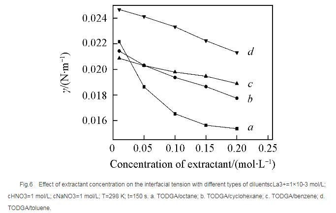 如图8所示,以正辛烷作为稀释剂时, TODGA/HNO3萃取La3+的界面张力随着硝酸浓度的升高逐渐降低。根据文献报道,在硝酸体系中, 3-氧戊二酰胺类萃取剂能够萃取硝酸,萃取过程中随着硝酸浓度升高,萃取分配比明显增大。因此,硝酸浓度较高时TODGA与硝酸发生萃取缔合作用,使中性萃取剂TODGA质子化,其界面活性明显增强,导致界面张力迅速降低,这与图3结果一致。