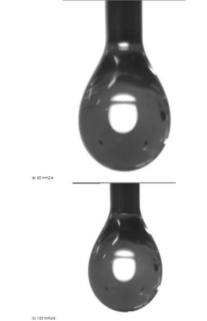 根据液滴的形成过程,实验选用液滴下落前的临界悬停状态图像,进一步测量了不同黏滞性硅油的表面张力系数,图4为黏度系数为50、100、350和500 mm2/s硅油样品的悬滴形态照片。