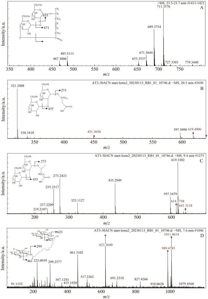 图2(A)乙酰化SLs保留时间为23.6 min组分的质谱图.(B)去乙酰化SLs保留时间为20.3 min组分的质谱图.(C)去乙酰化SLs保留时间为9.4 min组分的质谱图.(D)去乙酰化SLs保留时间为7.6 min组分的质谱图
