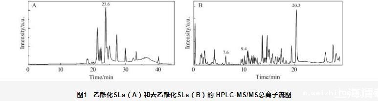 图1乙酰化SLs(A)和去乙酰化SLs(B)的HPLC-MS/MS总离子流图