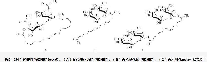图3 3种有代表性的槐糖脂结构式:(A)双乙酰化内脂型槐糖脂;(B)去乙酰化酸型槐糖脂;(C)去乙酰化bola型槐糖脂