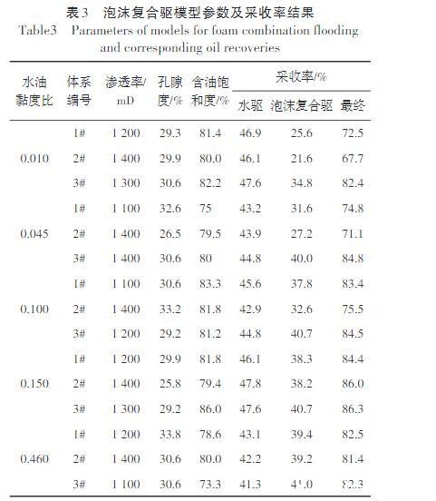 不同水油黏度比下的复合体系驱油结果(图5)同时证明,增大水油黏度比和扩大波及对稠油化学驱至关重要。因此,研究中考虑通过水气交替的方式引入泡沫(交替注入0.3PV复合体系和0.3PV空气,单个复合体系段塞或空气段塞尺寸为0.1PV),辅助复合体系扩大对稠油的波及。在水油黏度比分别为0.010,0.045,0.100,0.150和0.460时,开展了不同性能体系泡沫复合驱油实验,判断泡沫辅助下复合体系乳化对稠油驱替的影响,并与单独复合体系驱油对比。实验模型参数及采收率结果如表3和图6所示。表3泡沫复合驱模型参数及采收率结果