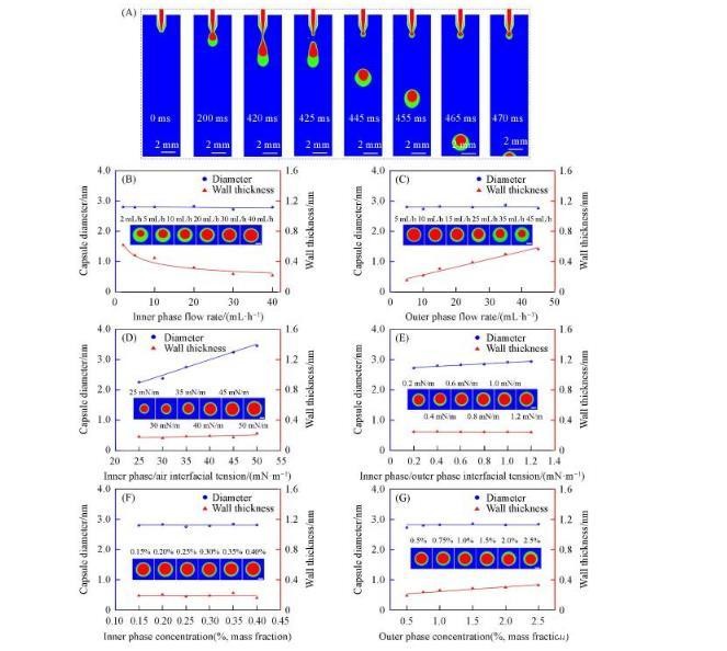 数值模拟与实验结果具有较好的一致性,数值模拟内相/外相流速对水/水微囊直径和壁厚的影响,得出了与实验数据一致的规律,即水/水微囊的直径基本不随内相/外相流速的变化而变化,而水/水微囊壁厚随内相流速增加或外相流速减小都将减小,如图4(B)和(C)所示。与实验相比,数值模拟可以更系统地调节各个参数,如外相/空气界面张力、内相/外相界面张力对微囊直径和壁厚的影响。随着外相/空气界面张力的增加,水/水微囊直径成比例增加,这是由于外相/空气界面张力使微囊悬挂在管口,重力使微囊脱离管口,当外相/空气界面张力增加,需要的重力相应增加,造成水/水微囊直径增加。当内相/外相界面张力增大时,水/水微囊直径略有增加。