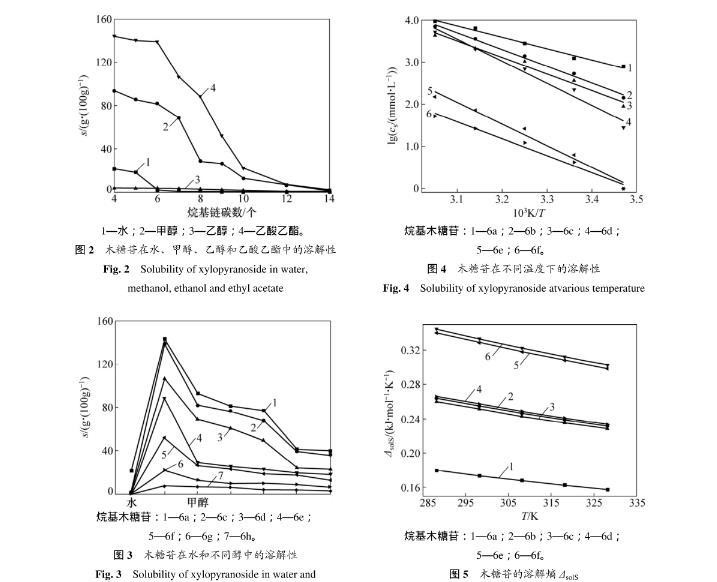 分别测出化合物6a~6f在15,25,35,45和55℃时溶解度3,再根据式(1)计算各烷基木糖苷的溶解焓(solH)。