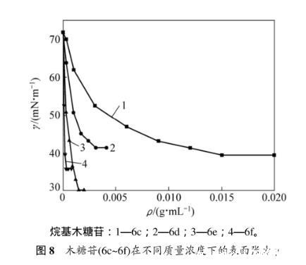 表3所示为烷基-β-D-吡喃木糖苷6c~6f的临界质量分数及所对应的表面张力。溶液表面的吸附量达到饱和时(刚好饱和时的浓度即为临界浓度),表面张力最小。从表3可以看出:辛基-β-D-吡喃木糖苷(6e)达到临界浓度时对应的表面张力是最低的,能力最强。因为烷基木糖苷的表面活性是由其亲水糖基和疏水烷基链共同决定,当烷基链长为=8(糖苷6e)时,亲水性和疏水性达到最佳平衡,表面张力最低。
