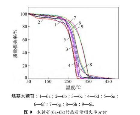 图9所示为热质量损失结果。从图9可见:烷基吡喃木糖苷6a~6i均只有1个质量损失台阶,起始分解温度分别为157.9,177.3,172.6,162.3,164.1,169.5,151.7,170.4和208.9℃左右,最大分解速率时的温度依次为283.2,287.8,296.6,257.9,290.4,286.1,301.9,262.7和339.8℃。糖苷6a~6i热分解完时的温度分别为303.1,298.1,329.6,365.5,320.4,340.2,332.0,374.6和356.2℃。总质量损失率为94.9%,89.9%,91.0%,91.9%,95.3%,96.6%,89.6%,88.5%和91.5%。结果表明:合成的烷基吡喃木糖苷在150℃以下是稳定的。