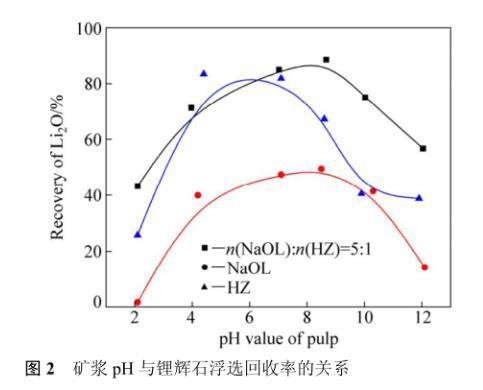 在不同捕收剂浮选体系中,固定药剂用量为200 mg/L,考察了矿浆pH对锂辉石浮选行为的影响,如图2所示。对于NaOL,在矿浆pH=4~10的范围内其能较好的浮选锂辉石。在强酸性(pH<3.0)、强碱性(如pH>11.0)的矿浆环境下NaOL几乎不能浮选锂辉石。pH=8.5时,NaOL对锂辉石的浮选效果最佳,此时回收率为49.53%。对于HZ,最佳浮选pH区间为4~7.5,即中性或弱酸性区域内HZ能较好地浮选出锂辉石,而在强酸性和强碱性条件下对锂辉石的浮选效果较差。使用(NaOL):(HZ)=5:1组合捕收剂时,发现在pH>7区间内,组合捕收剂的捕收性能优于HZ的,同时在广泛pH区间内组合捕收剂的捕收性能优于NaOL的。因此,可以看出,HZ和NaOL这两种捕收剂的混合使用只在弱碱性条件下显著提高了其捕收性能。同时可确定(NaOL):(HZ)=5:1组合捕收剂在pH=9.0的条件下浮选效果最优,回收率为88.48%。
