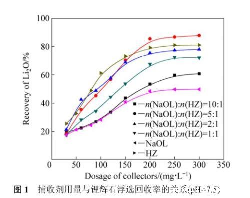 图1捕收剂用量与锂辉石浮选回收率的关系(pH=7.5)
