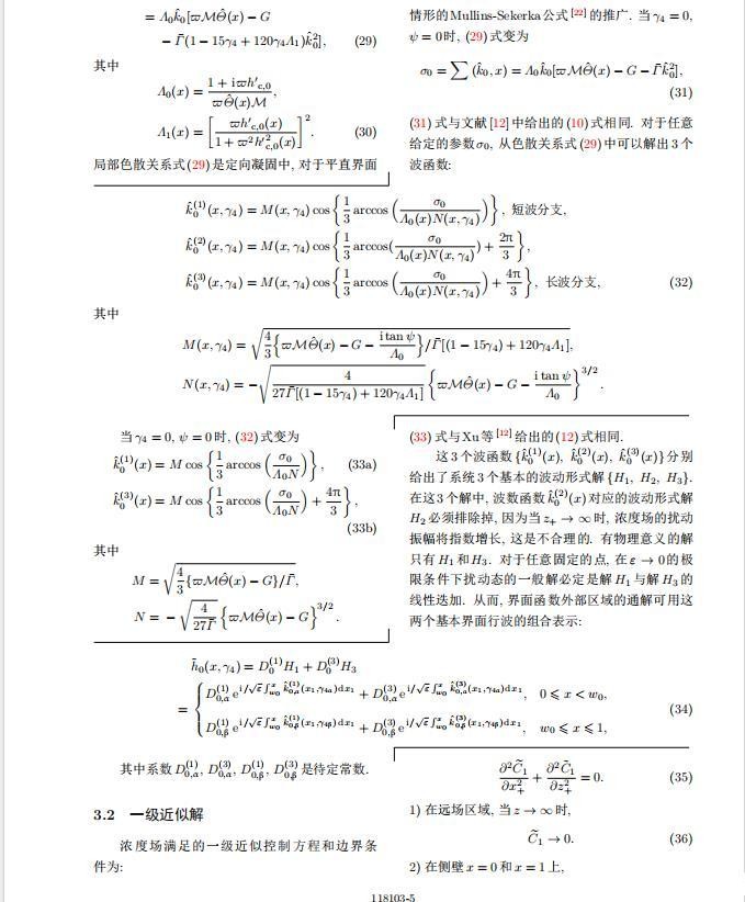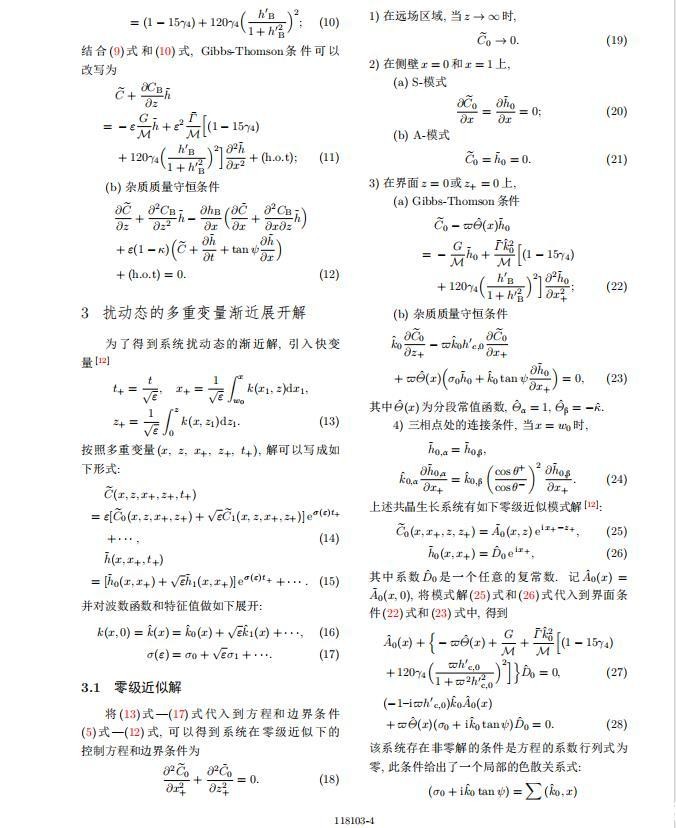 为考察共晶生长形态稳定性,利用共晶生长的定常解作为基态进行稳定性分析.在初始时刻t=0时对基态解做一小扰动,并将在t>0以后形成的非定常解分解成两个部分: